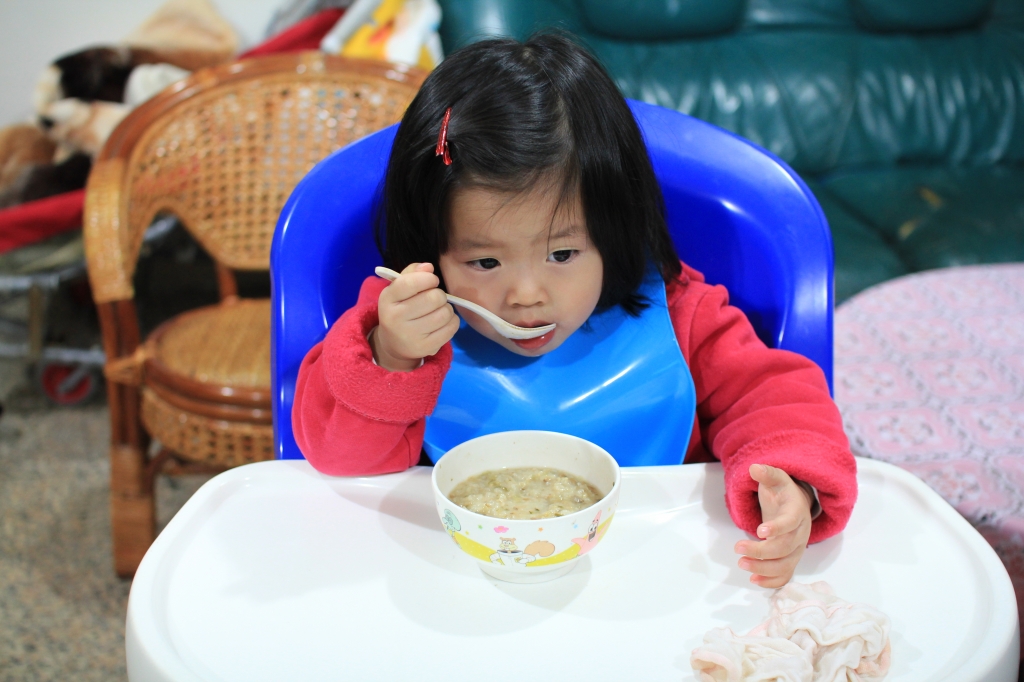 我用新的圍兜自己吃飯